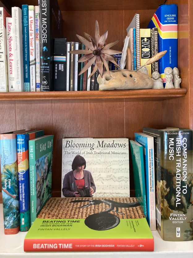 Imagine my astonishment, then, when I realized I was talking with Fintan Vallely, Ireland’s preeminent expert on Irish traditional music and a highly accomplished flute player. He has been writing, speaking, teaching, and advocating for traditional music for over fifty years. I have a decent collection of his writing, suitably curated in the title photograph. I have relied upon his books and articles as sources of sound information (especially the series of Companion Guides), stimulation, and writing inspiration.